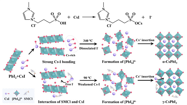 近日,华东师范大学方俊锋、李晓冬团队聚集反向钙钛矿电池,在前期表界面能带调控的基础上(Adv. Mater. 2024, 2410273Adv. Mater. 2024, 2311025),针对CsPbI3结晶温度高的问题,提出CsI键弱化策略,通过引入1-丙基磺酸-3-甲基咪唑鎓氯化物(SMCl)有机磺酸盐,实现CsPbI3的低温结晶。SMCl可以与CsI有较强的相互作用,弱化Cs—I键,使CsI解离出自由I,促使初始PbI2有效转变为[PbI6]4−,显著降低CsPbI3的结晶温度至90°C。基于此,制备出柔性的全无机CsPbI3钙钛矿电池,效率达到13.86%,是柔性CsPbI3器件的最高效率。器件经过36000次弯曲实验后,电池效率几乎没有损失。