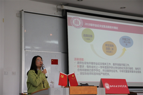 学院副院长徐敏从一流专业申报、全国部分地区大学生物理竞赛、拔尖学生培养、本科教学工作量调整、2018级毕业论文题目征集、公开课活动、困难学生帮扶等方面进行通报。