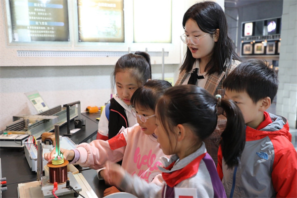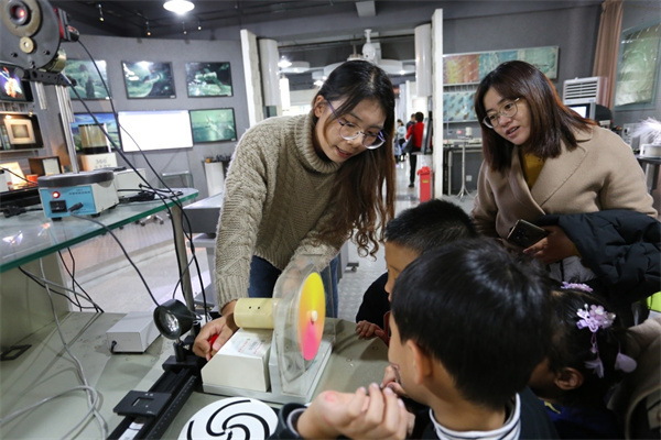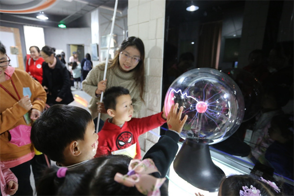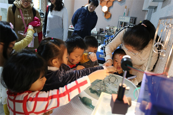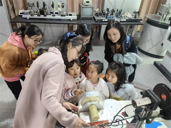 在物理实验教学中心的科普基地,志愿者向小朋友们展示了静电球、能量穿梭机、角动量演示器、电流展示仪和动力发电装置等有趣的实验装置和仪器,解释了其中蕴含的物理知识和奥秘,孩子们在看展示、听讲解和动手操作中更加地贴近物理、了解科学。