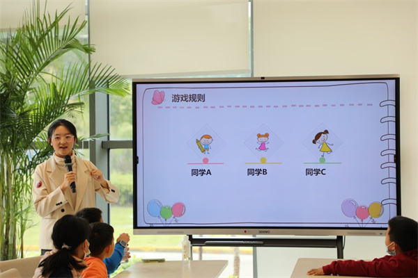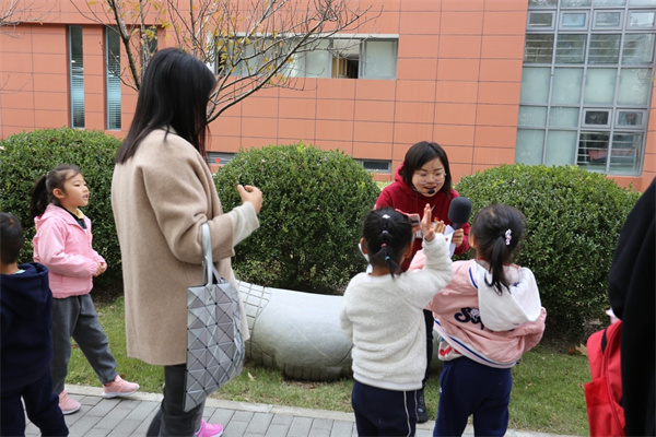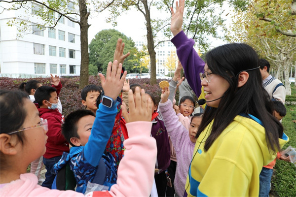 在前往物理实验教学中心途中,小朋友们在志愿者的组织下唱儿歌、讲故事、猜谜语等,了解有关党、团的知识。