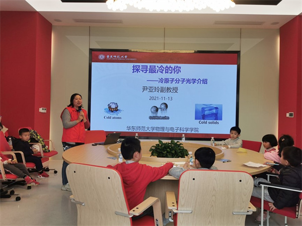 物理实验教学中心教工党支部书记、副主任尹亚玲副教授,以《探寻最冷的你》为题,为少儿组小朋友作科普报告。尹亚玲从生活中的小问题入手,在问答和互动中,向孩子们普及了绝对零度等有关于温度的物理学知识,孩子们积极发言,领悟物理的奥妙。