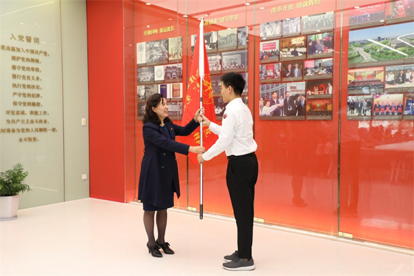 随后,李恺为学院“追光”党员服务先锋队授旗,学院2020级研究生第一党支部书记、凝聚态物理专业博士研究生李树兵同学作为代表接旗。