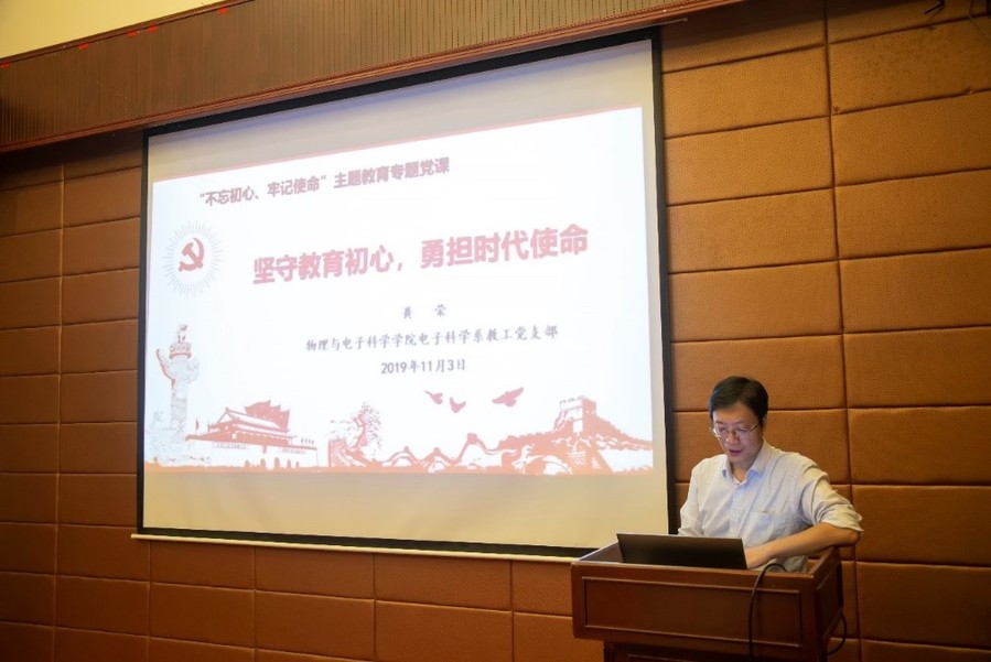 黄荣以“坚守教育初心、勇担时代使命”为题,带领支部党员学习了习近平总书记关于教育工作的重要论述摘编,明确了新时代教育工作者的初心是“坚持立德树人,为党为国育人健才”,使命在于“培养德智体美劳全面发展的社会主义建设者和接班人”,同时提出,作为高校教育者,在人才培养过程中,要紧密围绕课程建设、教学科研等中心工作持续优化和改进,成为先进思想和科学文化的传播者。