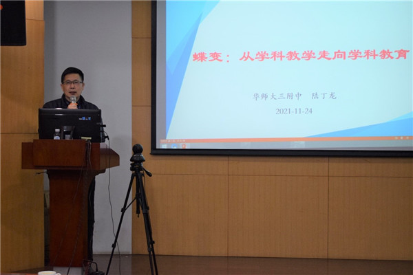 陆丁龙首先诠释了“蝶变”“学科教学”“学科教育”三个关键词的内涵,他认为教育包含教学,前者注重过程,后者注重结果。随后,他从国家政策切入,为同学们解读了“双新”背景下的课程教学新要求,并从“素质教育的主场域在课堂”“影响课堂教学能效的归因分析”“如何从学科教学走向学科教育”三个方面,结合教学实践中的具体案例,对如何促成教学到教育的“蝶变”这一关键问题详细分享了自己的心得体会。
