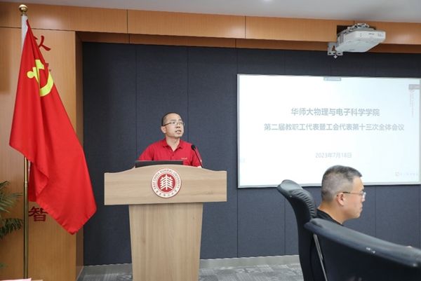 7月18日下午,胜游体育第二届教代会第十三次会议以线上线下相结合的方式,在闵行校区物理楼三楼多功能厅举行,讨论并审议《华东师范大学胜游体育绩效实施方案(2023年修订)审议稿》。学院党政班子成员及教代会代表共47人参加,工会主席赵振杰主持本次会议。