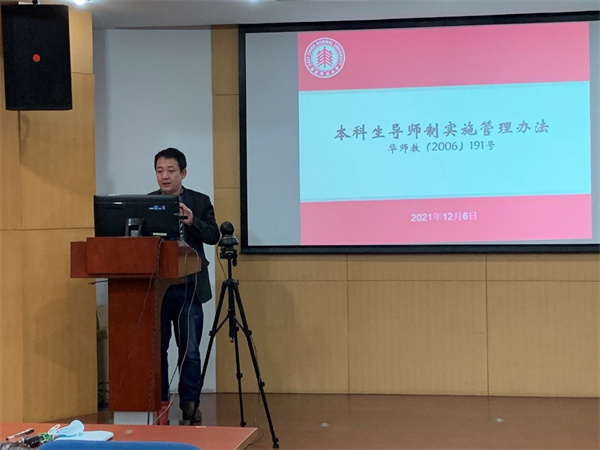 副系主任彭晖解读了华东师范大学《本科生导师制实施管理办法》,重点说明学校设立本科生导师制的目的和要求,希望把本科生导师制工作落到实处,通过导师的人格和学术魅力影响学生的学习生活和品德形成。针对即将到来的期末考试,他强调了考试纪律,鼓励同学们认真复习备考,考出好成绩。