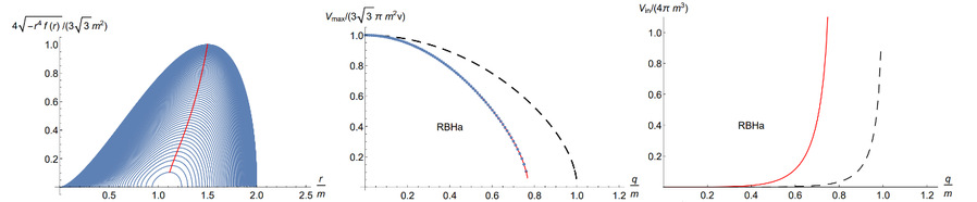 右图:内视界内的体积(已4πm3归一化)和q/m增长的关系。黑线为RN黑洞情况作为对比。