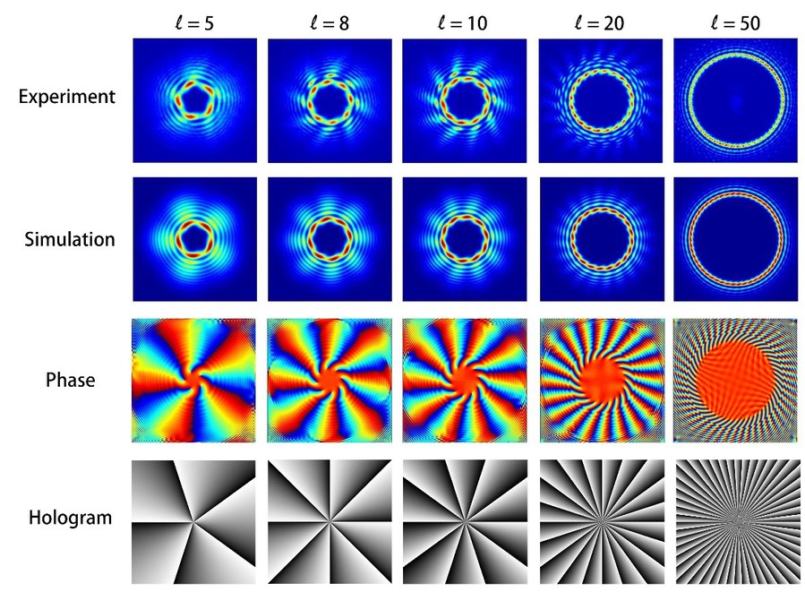 光学涡旋由于具有轨道角动量,在光通信、粒子操控、图像处理和量子信息等领域引起了广泛关注。在这些应用中,光学涡旋所含轨道角动量的测量和验证在相关研究中具有重要意义。近年来,测量光束的轨道角动量的方法主要有干涉法、小孔衍射法和柱透镜法等,其中报道的很多干涉法都采用了Mach-Zehnder干涉仪的方案,用分束器将一束光分成两束之后进行合束再干涉,但是在这些实验中并没有控制干涉光路的位相,所以并不是真正的干涉,而是两路光强度的叠加,或者是不同偏振模式的叠加。潘晟哲提出了一种更为简单的干涉法,主要利用了空间光调制器对光束不完全调制的特性,有一部分的未调制光和调制光叠加在一起,这两束光的位相差恒定,产生螺旋花瓣状的干涉图样。由于实验和模拟结果的完全符合,可以得到干涉图样的光强分布和相位分布,不管是干涉图样中花瓣的个数,还是相位分布中的角向周期数,都对应了光束携带的轨道角动量的值。因此达到了仅用一束光测量光束的轨道角动量的目的。