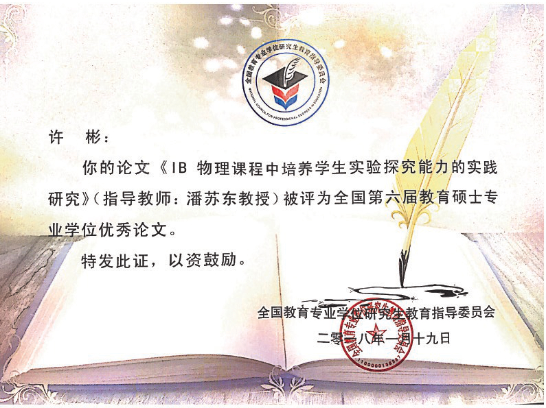 经全国教育专业学位研究生教育指导委员会组织专家组评审,全国 52人的学位论文被评为全国第六届教育硕士专业学位优秀论文。其中胜游体育许彬同学的论文《IB物理课程中培养学生实验探究能力的实践研究》(导师潘苏东教授)被评为全国第六届教育硕士专业学位优秀论文。