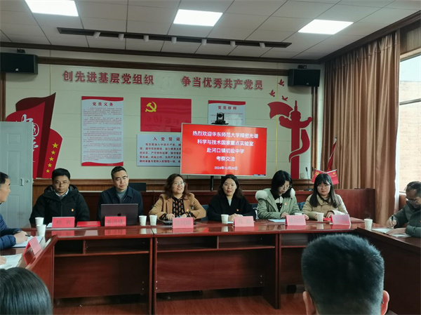 12月20日上午,考察团前往寻甸县河口镇初级中学开展座谈交流。河口镇党委组织委员李俊仙,河口镇初级中学党支部书记、校长杜建林等同志介绍了中学在教育教学、支部建设、特色课程、教师培养等方面的基本情况,交流了学校事业发展中面临的困难及期待通过合作共建达成的目标。郑利娟介绍了精密光谱科学与技术国家重点实验室的基本情况。潘海峰分享了支部基本情况,围绕“引领发展、厚植精神、全面育人”三项核心任务,交流了支部品牌建设的经验。