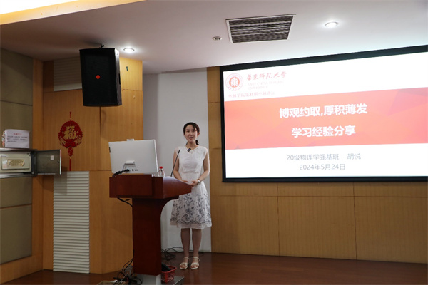 优秀学生榜样胡悦分享了自己的学习和科创经验。她谈到,高中和大学学习内容和学习方法不同,要学会清零,转变思维,转变学习方式,并强调投入专业学习要内化与心法,外化于行,核心即“自主”二字。在科创经验分享中,胡悦分享了科创的三种类型,并分享了自己参加大学生科技创新竞赛、大学生创新创业训练计划项目和本科生科研的经历,详细介绍了科创项目的申报流程和申报经验。她鼓励同学勇敢迈出第一步,主动联系导师,体验先进科学装置,追赶科学前沿问题。