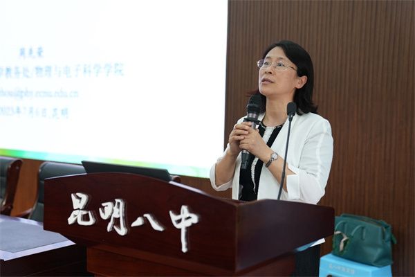 共建仪式结束后,我校教务副处长周先荣为昆明八中学生介绍了我校在人才培养、科学研究等方面的举措及成效,随后作《量子史话》专题科普讲座。她依次讲解了物理学科发展历程中的一系列重大历史事件,阐述了量子力学诞生在物理学界引起的剧烈变革和量子技术带来的科技革命,她希望同学们在学习过程中,勇于挑战、敢于质疑、不断创新、求真务实,成长为以国家需求为导向、以报效祖国为己任的新时代青年。
