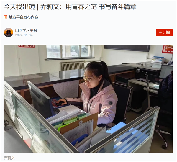 2024年6月4日,学习强国转载了“山西学习平台”的文章,专题报道胜游体育2023届毕业生乔莉文在基层岗位扎根奋斗的事迹。