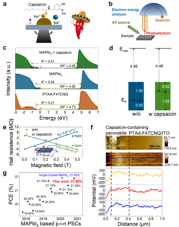 2021年初,保秦烨教授课题组把天然分子辣椒素作为添加剂引入到钙钛矿半导体,结合光电子能谱与光电器件,在国际上首次直接观察到软物质钙钛矿半导体表面电子结构从P型转变成N型的新现象。