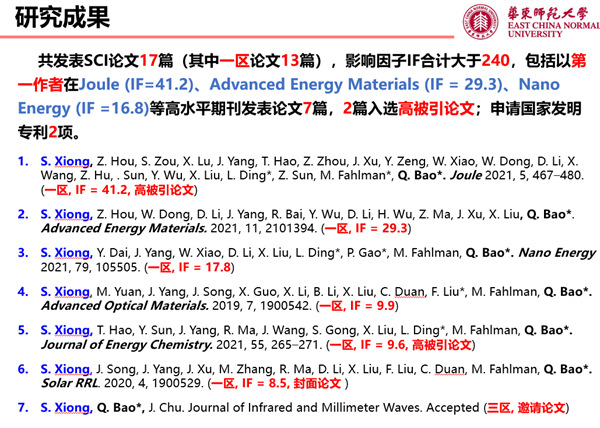 共发表SCI论文17篇(其中一区论文13篇),影响因子IF合计大于240,包括以第一作者在Joule (IF=41.2)、Advanced Energy Materials (IF = 29.3)、NanoEnergy (IF =16.8)等高水平期刊发表论文7篇,2篇入选高被引论文;申请国家发明专利2项。获2019年华东师范大学研究生国际会议专项基金,赴美国参加MRS材料年会并作成果展示。