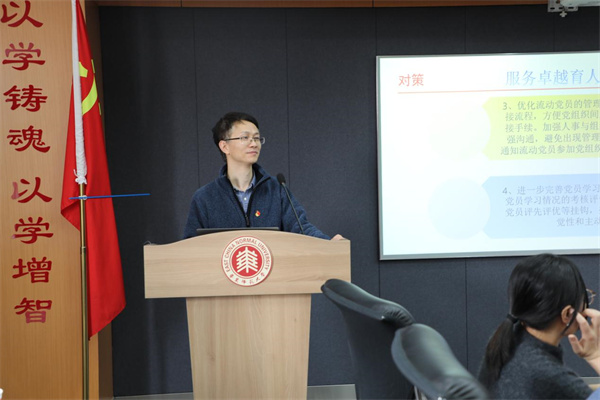 会上,李恺传达学习了《中国共产党不合格党员组织处置办法》《关于进一步加强和改进流动党员管理工作的意见》和党员队伍建设工作座谈会精神,就学院党委流动党员管理及不合格党员处置做出明确要求,并就学院党委党建工作意见建议进行了征询交流。
