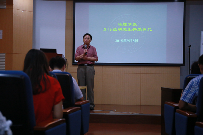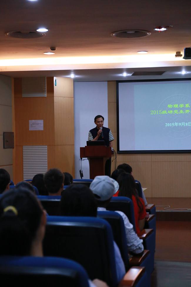 系主任黄国翔对物理系的概况,特别是雄厚的科研力量和师资力量做了介绍,他代表物理系对新同学的到来表示热烈的欢迎,希望同学们及早进行角色转换,掌握适合自己的学习科研方法,培养独立科研的能力,做出创造性成果,成长为高素质人才。