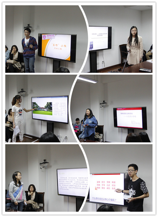 物理学系的学生党员和“老”入党积极分子也没有落后,各出奇招,对“访革命故居,寻红色印记”为主题的观访活动进行了汇报。出于对革命先辈 烈士敬仰和崇拜,6个小分队分别对宋庆龄故居纪念馆、龙华烈士陵园、中共“一大”会议旧址等红色景点进行了参观和深度游,他们以“访一个人物,讲一个故 事、记一段历史”为主线呈现出了不同的观访记录和感想,他们用诗句、用照片、用视频、用脚步、用心记录和体验着中国共产党的伟大历史和革命先辈的生平功 绩,历史的感召力是无穷的,各小分队成员都表示受益匪浅。