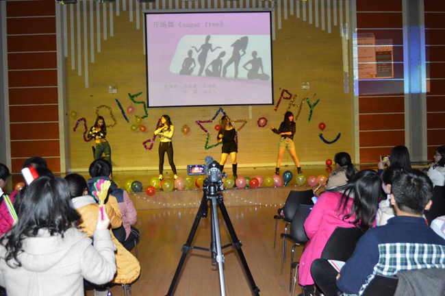 祝福视频播放完毕后便是火辣劲爆的开场舞sugar free,它点燃了全场观众的热情,在这热烈的氛围中“ Wu动梦想,  Li赞青春”2015研究生元旦晚会的序幕缓缓拉开。台上演员卖力表演,台下观众也是掌声不断,叫好声连连。由李佳隆、聂啸宇两位同学表演的相声《十点钟 的太阳》可以说是整个晚会最大的亮点,让大家有幸在2014年末一睹理科男货真价实的相声范儿。由吕丛爱等同学带来交谊舞《爱的华尔兹》亦是引起全场另一 波高潮,女生优雅男生绅士,赏心悦目。欧湘慧等同学主演的小品《西游歪传》,金句多多,令人捧腹。其他的节目也是精彩连连,博得同学们掌声不断。此次晚会 除了精彩的节目表演之外,更有游戏环节、抽奖环节和微博墙互动,使得本次的元旦晚会愈加精彩。   持续将近两个小时的元旦晚会历经一个月的筹划和准备,期间演员们百分百的参与和投入,研究会工作人员无私付出,2014级研究生班委鼎力协助,院系领导老师更是大力支持。 12月27日,2015年物理系研究生元旦晚会终于在大家的笑声和掌声中圆满落幕!