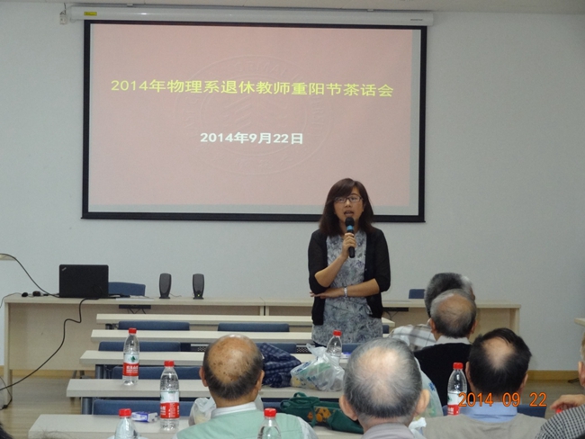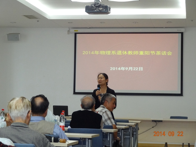 9月22日下午,在“九九重阳节”即将到来之际,为了弘扬尊老、敬老、爱老、助老的传统美德,让退休教师度过一个欢乐祥和的节日,物理学系在中北校区理科大楼A228室举行了2014年退休教师重阳节茶话会,将近50名退休教职工参加了本次活动。