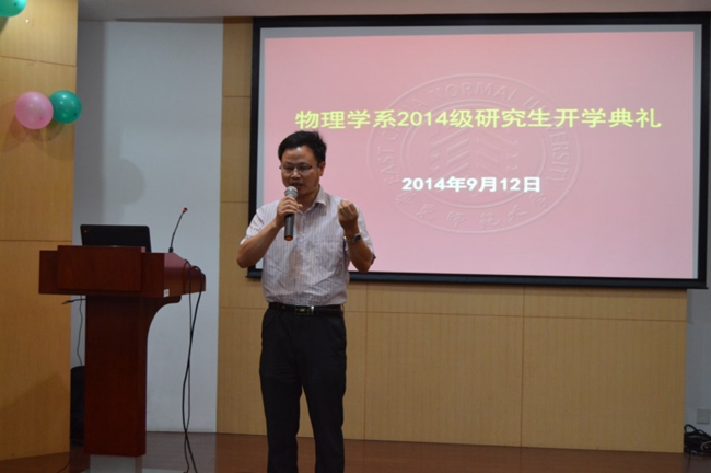 9月12日,物理系研究生开学典礼在闵行校区物理楼226报告厅顺利召开。中北校区和闵行校区的2014级新生齐聚一堂,物理系主任黄国翔、副系主任徐敏、教师代表刘宗华等出席了开学典礼并发表了讲话,典礼由系党委副书记马红梅主持。