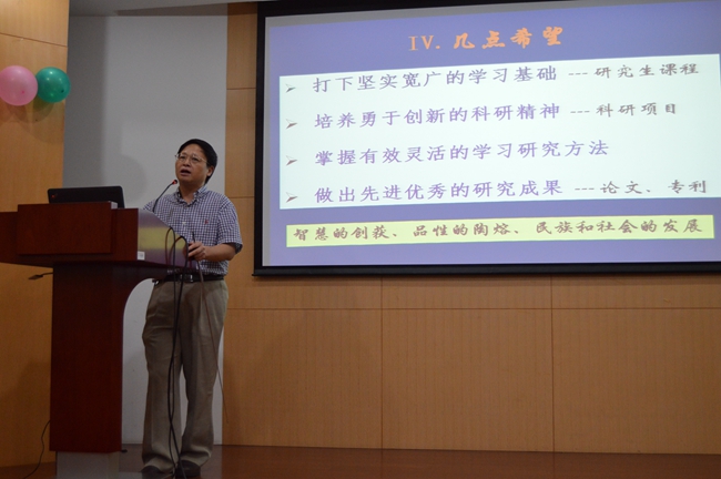 之后,作为一线科研教师代表的刘宗华教授以其风趣幽默的语言让同学们了解到科研魅力所在。基于多年的执教和科研经验,刘老师对初出茅庐的新生特别提出了三条学习忠告:转变学习风格;精读文献;善于提问。同学们用热烈的掌声向老师们表达了感谢。