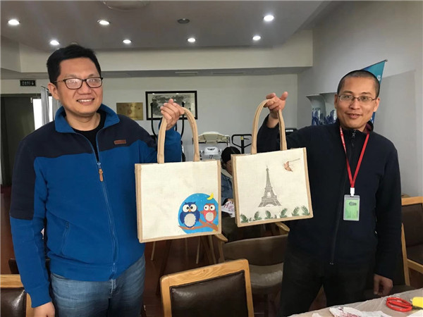 经过两个小时的制作,一件件生动的作品在欢声笑语中呈现出来。包的图案主要有花鸟、人物、景观、动物等不同系列。有的老师制作出“小黄人”系列图案;有的老师制作了“高定限量款”包包。大家互相讨论着自己的创意、配色和心得,脸上洋溢着开心的笑容。