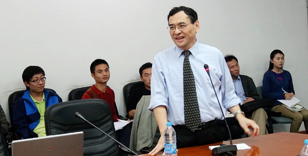 去年12月21日,陈建德校友回到母校,与获得美国校友会奖学金的学生交流。
