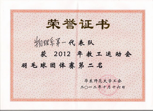 在刚刚结束的2012年华东师大校运动会上,我们物理系教职工抱着极大的热情参加了各项比赛。一共有20多位老师参加了健身跑,5位老师参加了定点投 篮,8位老师参加了羽毛球团体赛。其中由蒋瑜、杨光、徐敏、王清芝四位老师组成的羽毛球参赛队获得了校二等奖的好成绩。在此,我们热烈地祝贺他们,同时也感谢所有为本次运动会付出的老师们!