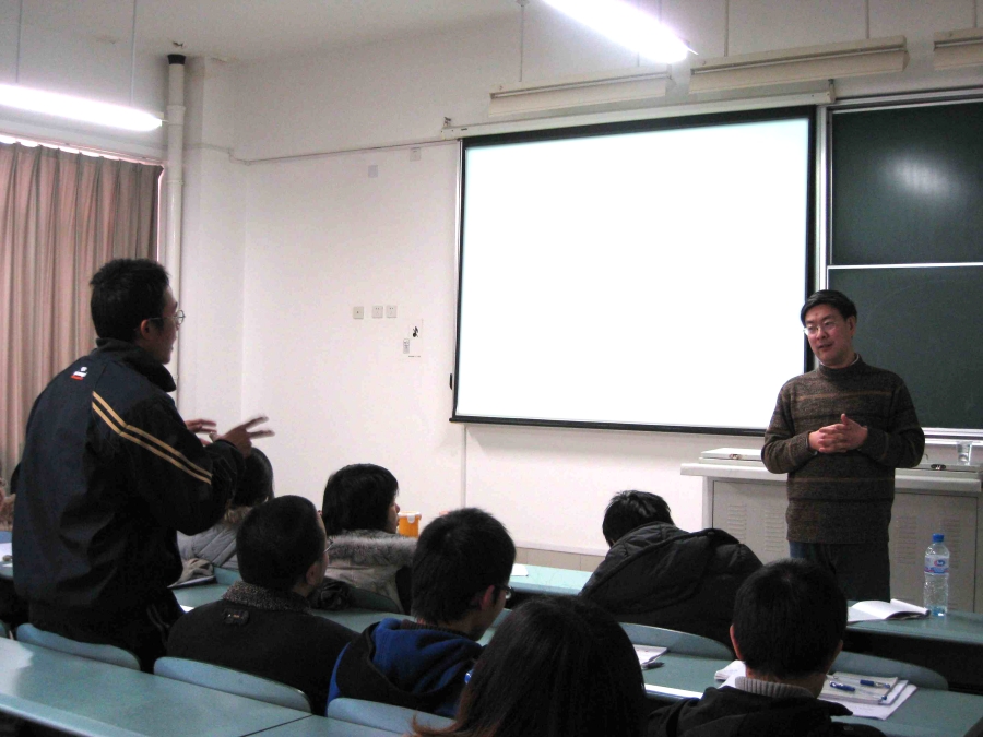 2009年2月27日下午,闵行校区四教402教室座无虚席。原来这是物理系系主任张卫平教授为物理系06级本科生开展的有关专业发展和未来就业的讲座。张老师特别重视本科生的培养工作,在百忙之中抽出时间,结合当前形势给予同学们及时的引导。分管教学工作的副系主任王向辉老师,以及06级辅导员赵强老师也一同前来,为大家指点迷津。