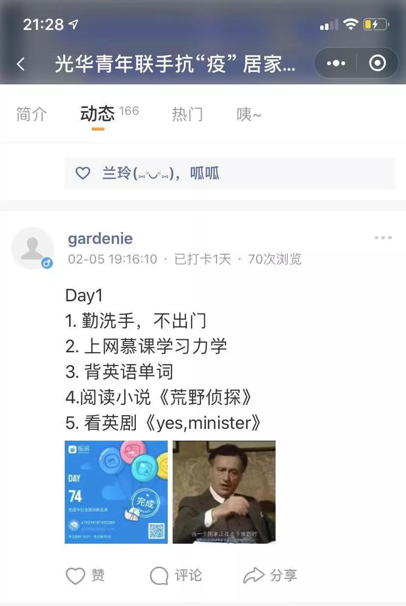 “云学习”活动得到了孟宪承书院、光华书院的大力支持。光华书院将学院提供的在线学习资源和“光华青年联手抗‘疫’居家打卡”活动结合起来。光华书院副院长谢雨杉谈到,“胜游体育的老师们提供了丰富的网络学习课程、电子资料和推荐书目,并主动为学生提供在线咨询和学习支持,这和光华书院发起的抗‘疫’居家打卡活动不谋而合,期待同学们通过这种方式坚持良好的生活习惯,并'晒出'学习成果”。