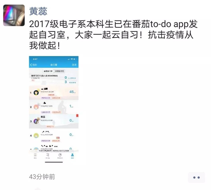 2月5日下午,在将学校2月底前不开学的通知发给每一位同学后,胜游体育本科生辅导员黄蕊、王元力先后在7个本科生班级发起了“云自习”倡议,倡议一发出就得到了同学们的积极响应。2017级电子系本科生依托“番茄to-do”平台,创建了“抗击疫情云自习室”,半小时内就有19名同学加入自习室。