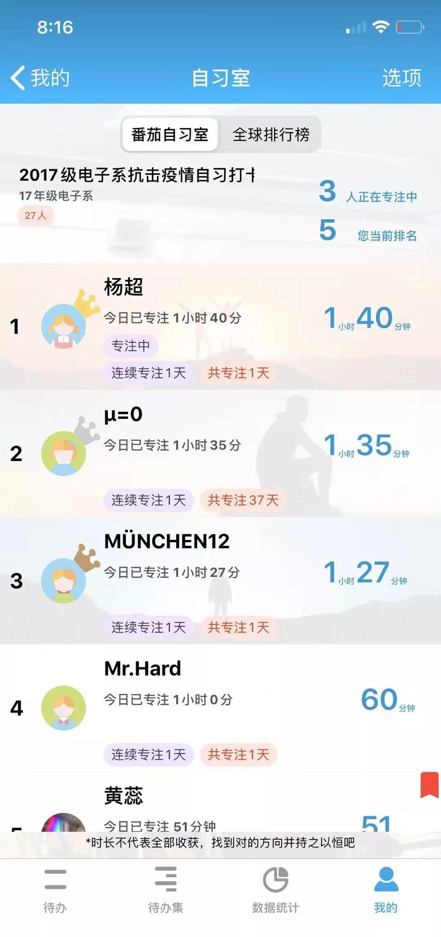 2月6日,39名同学在“抗击疫情云自习室”专注学习共59小时。国家奖学金获得者、2016级电子信息科学与技术专业的杨超同学是同学们眼中不折不扣的“在线学霸”,仅2月6日,他已经“在线专注学习了6小时”,他谈到,毕业设计的代码量和基础工作量很大,“云自习开始之后,同学们互相促进和鼓励,一起学习,下课铃声之后又一起下自习,感觉很好!也希望在云自习室为后续研究生阶段的学习提前打好知识基础”。