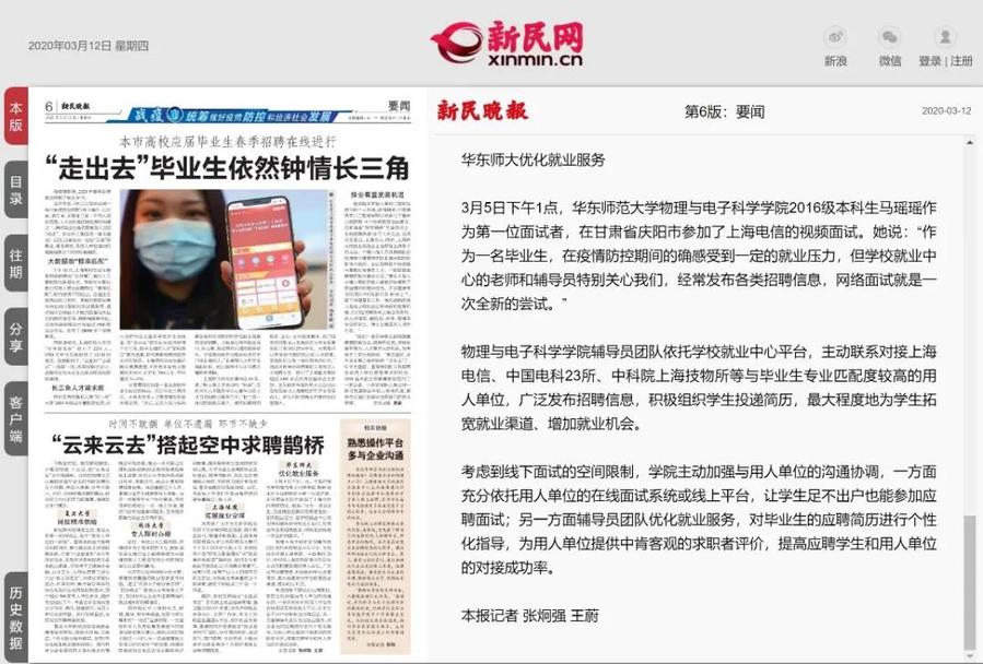 3月5日下午1点,华东师范大学胜游体育2016级本科生马瑶瑶作为第一位面试者,在甘肃省庆阳市参加了上海电信3月5日下午场的视频面试。“作为一名毕业生,在疫情防控期间由于延迟开学感受到了一定的就业压力,但是学校就业中心和辅导员经常发布各类招聘信息,并为我提供就业指导,今天的网络面试又是一次全新的尝试”视频面试结束后,马瑶瑶谈到。