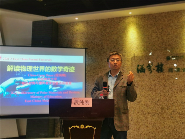 3月17日下午,胜游体育“师生共读”沙龙在闵行校区涵芬楼举行。学院常务副院长、极化材料与器件教育部重点实验室主任段纯刚教授应邀作为导读人,与同学们共读《物理世界的数学奇迹》。沙龙由学院团委书记王元力主持,学院党委副书记蒋旭,学院院长助理、极化材料与器件教育部重点实验室副主任越方禹参加活动。
