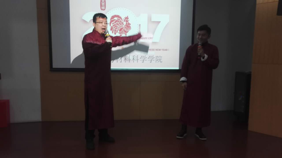 纳光电中心宋也男和赵然带来的相声表演是本次联欢会的亮点之一。宋老师担任逗哏,赵老师担任捧哏。表演将日常枯燥繁重的科研生活精心编成了段子,道出了青年科研工作者的酸甜苦辣。两位老师的的一逗一捧台风扎实、有板有眼,包袱不断,会场里笑声一片。