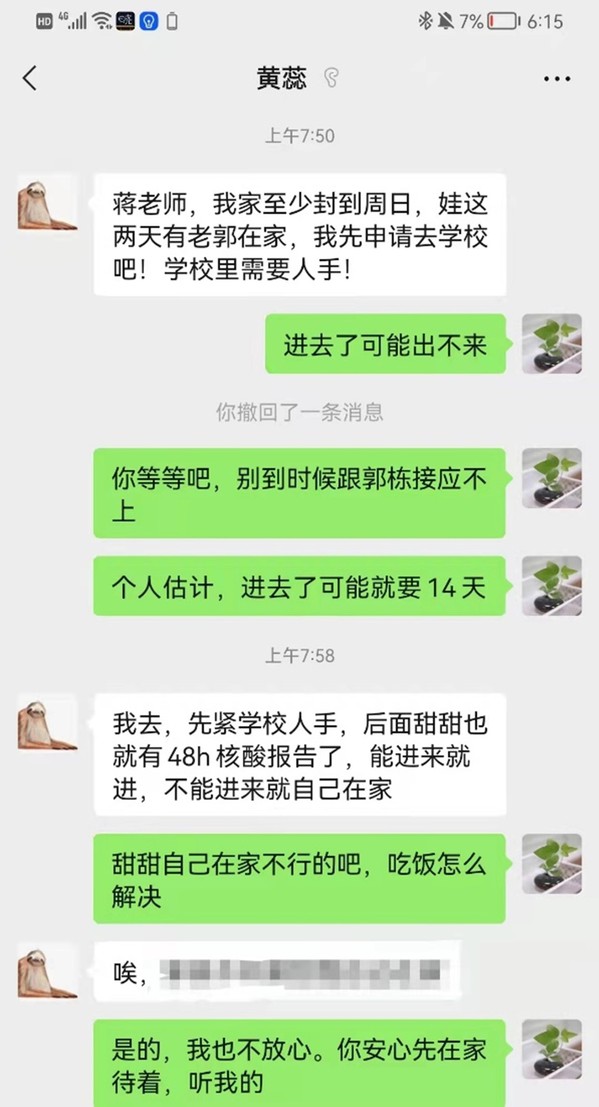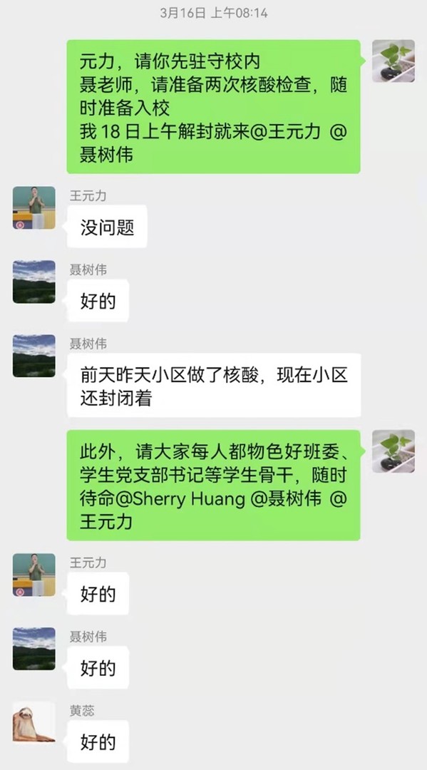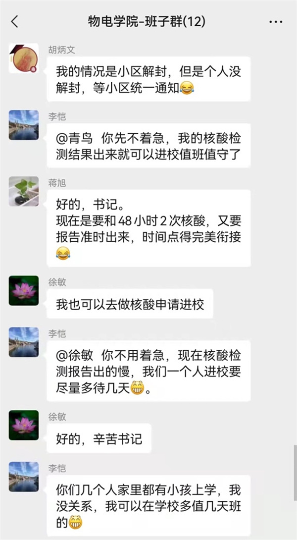 行政支部党员、学院人事秘书冯洁嫣及时跟进、督促每一位留校老师甚至家属的每一次核酸采样情况,做好结果统计和上报。一位留校教师谈到:“接到学院温暖的问候电话,让人放心、定心,觉得再难的疫情都不那么难熬了。”