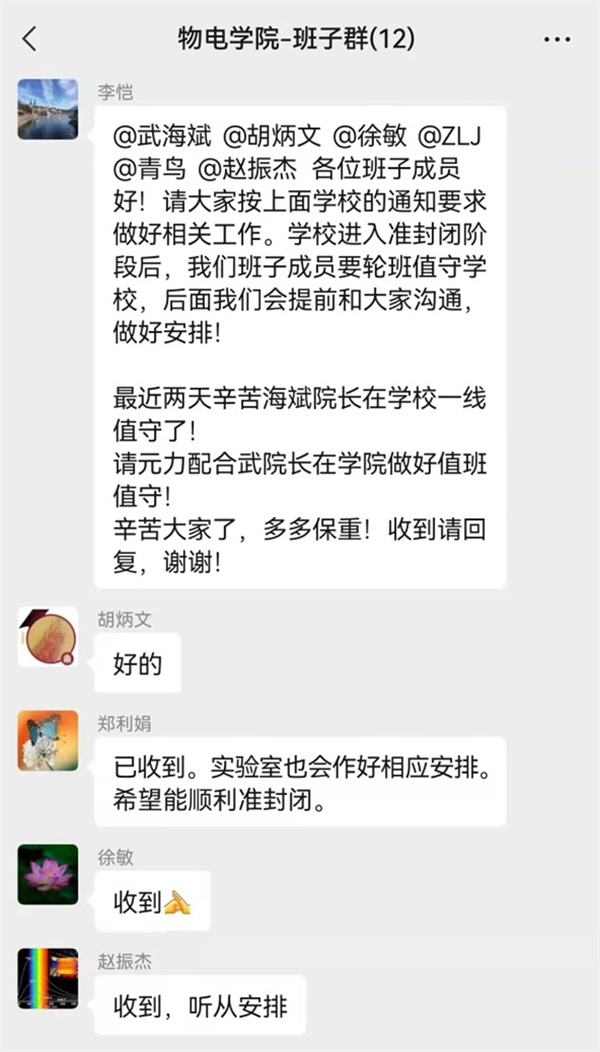 数名师生因重要教学、科研任务,分别留守在物理楼、信息楼、光学大楼以及实验A楼,学院党委迅速组建管理群,密切关注每一位在校留宿的师生,持续跟进关心,同时指导学院行政党支部书记、办公室主任袁会敏协同学院工会主席赵振杰,紧急采购生活物资,最大程度地解决留校师生食宿问题,并号召行政支部党员关心慰问退休老师。