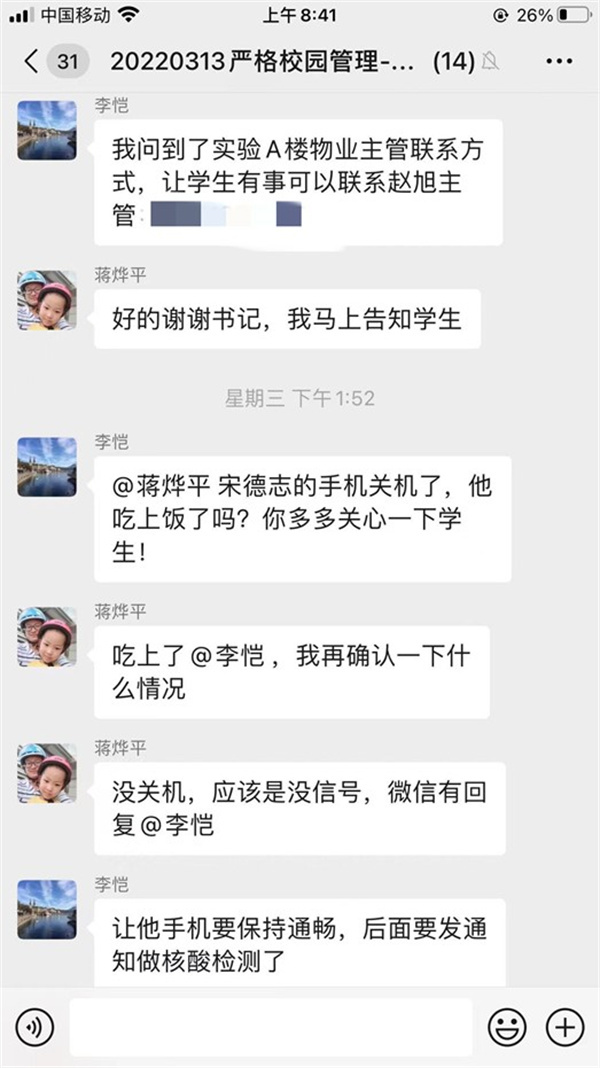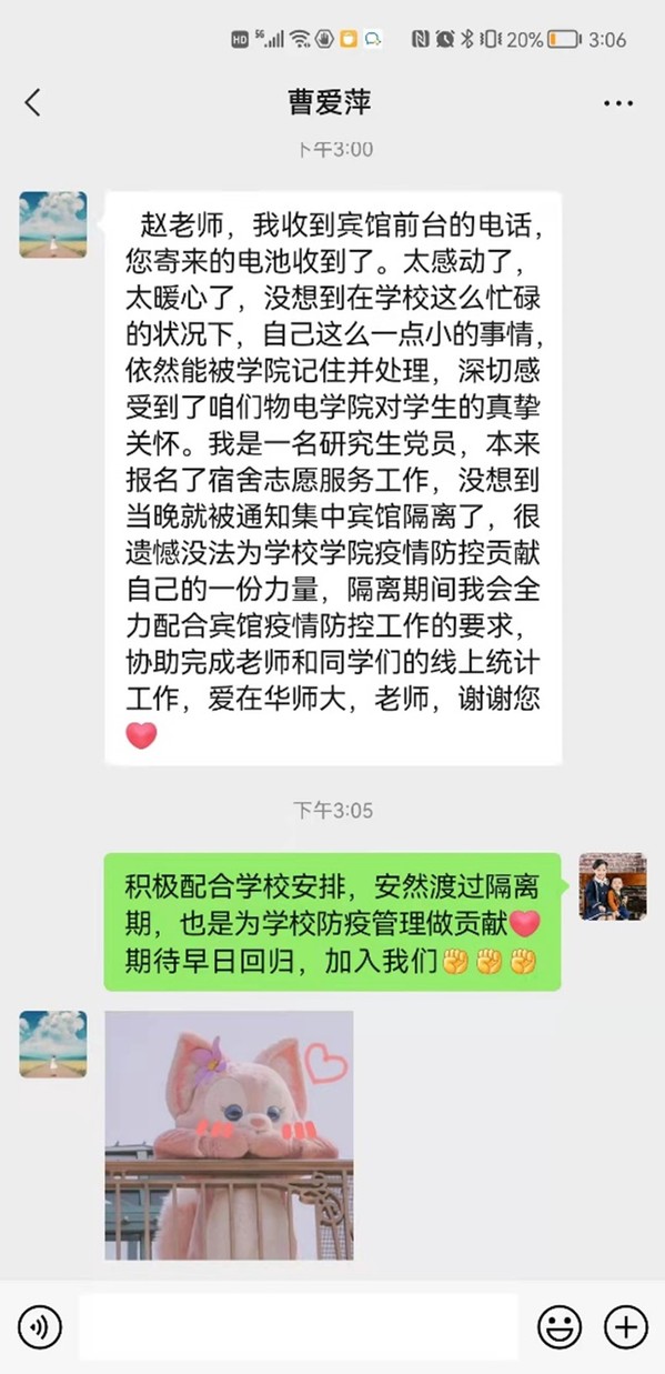 学院2020级博士研究生沈起炜在感谢信中写道:“由于疫情来得太突然,大部分的同学都没有携带电脑、充电器等设备,但是在辅导员的统筹安排下,从填报物品、到各楼宇志愿者师生负责打包并运输到楼下,最终安全无误地送到每一位同学的手中,使得无法科研和学习的同学能够在宿舍中也开展相关工作,让我们感动不已。与此同时,为了能够确保封楼期间我们学生的心理健康,各位老师还在线上组织相关的活动,和我们聊聊家常,排解压力。”