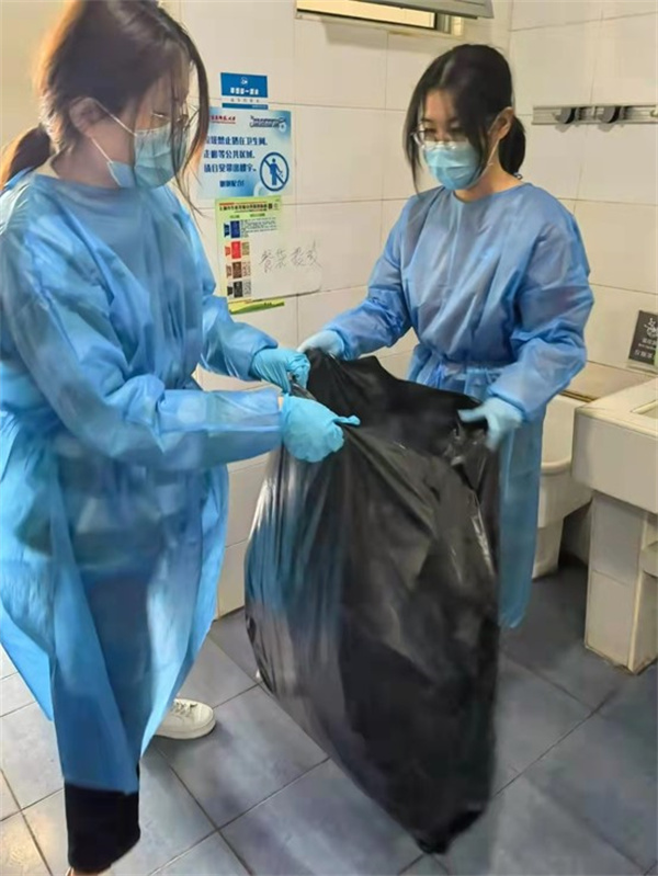2019级研究生第一党支部书记林建秋与学院党建服务中心孟婧在寝室楼内主动亮身份帮助宿舍楼同学处理生活垃圾。还有很多党员、入党积极分子同志也踊跃报名,争当志愿者,支援校园抗疫一线。