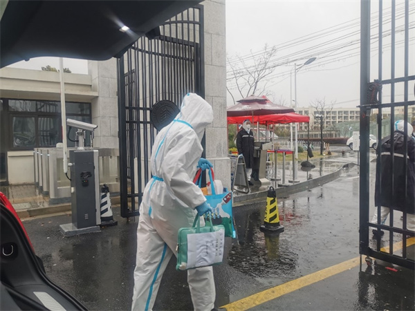 考虑到本科生辅导员黄蕊因所在小区封控管理无法入校,学院又先行调度专职组织员赵荣青携物资入校支援学工团队。