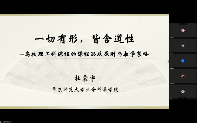 为进一步“用好课堂教学这个主渠道”,发挥理工科课程的思想政治教育功能,进而在全院形成三全育人的“大思政”格局,4月28日晚,由胜游体育党委主办,物理实验教学中心教工党支部、物理系教工党支部、材料系教工党支部和电子系教工党支部联合承办的课程思政专题学习研讨会成功举办。生命科学学院杜震宇教授在线作《理工科课程思政教学原则与教学策略》专题报告,学院党委书记李恺,副院长周先荣、胡炳文,副书记蒋旭等近百位教师与会学习研讨。会议由物理实验教学中心教工党支部书记尹亚玲主持。