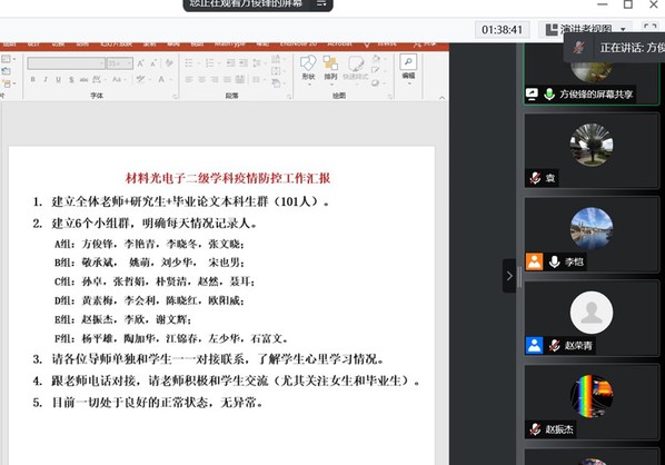 随后,学院各系所、中心、基地负责人分别介绍各单位“组团式”对接举措。物理学系系主任陈丽清谈到,物理学系与孟宪承书院、光华书院协同,将580名本科生纳入10个教师关怀小组中,各小组分别做好学业指导、生活关心、心理关怀并做好台账。材料科学系系主任保秦烨介绍了材料系“防疫工作协调小组”整体推进情况、 “一对一”定点关心材料专业本科生的落实情况。电子科学系系主任唐晓东介绍了以“科创兴趣小组”为举措,引导本科生专业志趣,落实精准对接的具体举措。纳光电集成与先进装备教育部工程研究中心主任方俊锋、上海市磁共振重点实验室主任姚叶锋、理论物理所所长刘宗华、凝聚态物理所所长杨洋、原子分子物理研究所所长张可烨分别介绍了各研究基地的落实举措。