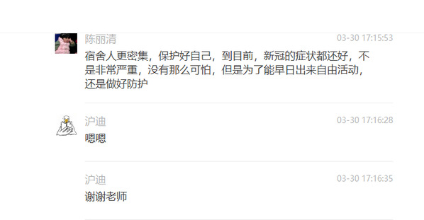 会上,杨洋带领大家学习了《上海市委市政府致全体市民的信》《致闵行校区全体同学的一封信》,鼓励大家积极响应上级党组织号召,众志成城,打好疫情阻击战。随后,支部党员、物理学系系主任陈丽清老师介绍了疫情期间关爱学生结对、问题跟进及反馈情况。