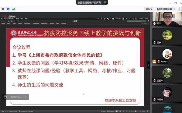 自疫情发生以来,物理学系教工党支部作为物理学本科教学的中坚力量,全力以赴做好“停课不停学”工作,坚决守好物理“云课堂”阵地。4月3日,物理学系教工党支部组织开展 “抗疫防控形势下线上教学的挑战与创新”主题党日活动,就在线课程及疫情期间学生结对相关情况进行交流研讨。支部书记杨洋主持会议,30余名支部党员线上参会。