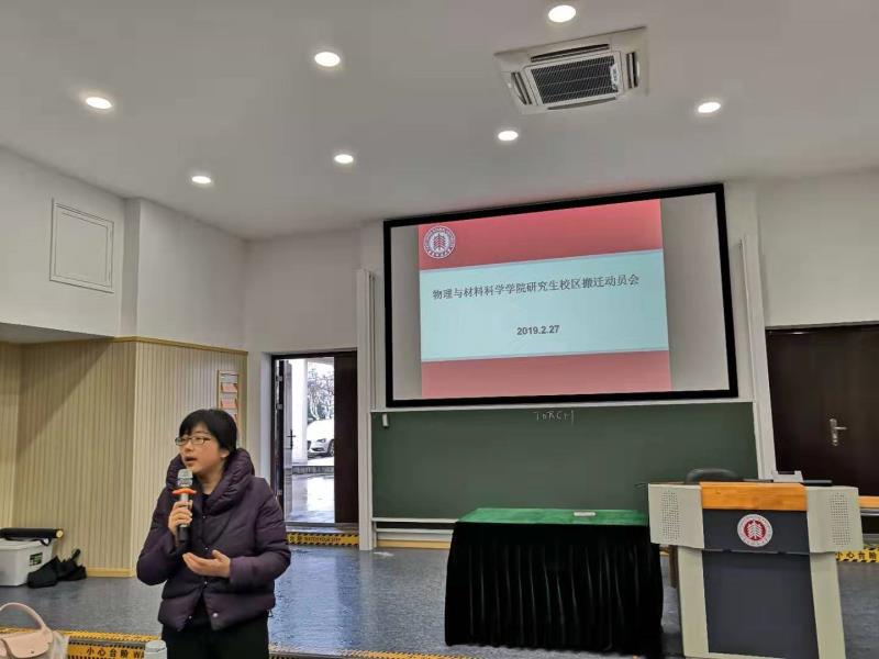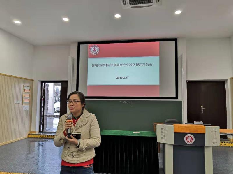 2019年2月27日下午,物理与材料科学学院在中北校区科学会堂阶梯教室召开了研究生校区搬迁动员会。中北校区全体研究生,物理系主任赵振杰,辅导员黄燕萍、王元力、聂树伟出席了动员会。动员会由学院党委副书记马红梅主持。