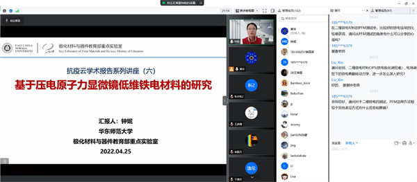 4月25日,研究员钟妮作题为《基于压电原子力显微镜低维铁电材料的研究》的学术报告,报告围绕课题组在二维材料CIPS的铁电极化调控、二维材料GeSe的铁性(反铁电-铁电相变)和HfZrO2薄膜的铁电极化及调控三个研究工作进行了详细介绍。