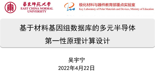 4月22日,青年研究员吴宇宁作题为《基于材料基因组数据库的多元半导体第一性原理计算设计》的报告。吴宇宁介绍了近年来国内外研究者及其所在课题组将新兴的材料基因组数据库和第一性原理高通量计算用于新材料设计研究,展示了基于基因组数据库和第一性原理高通量计算在高效设计和筛选稳定且具有特定性质的新型多元半导体中的突出优势。