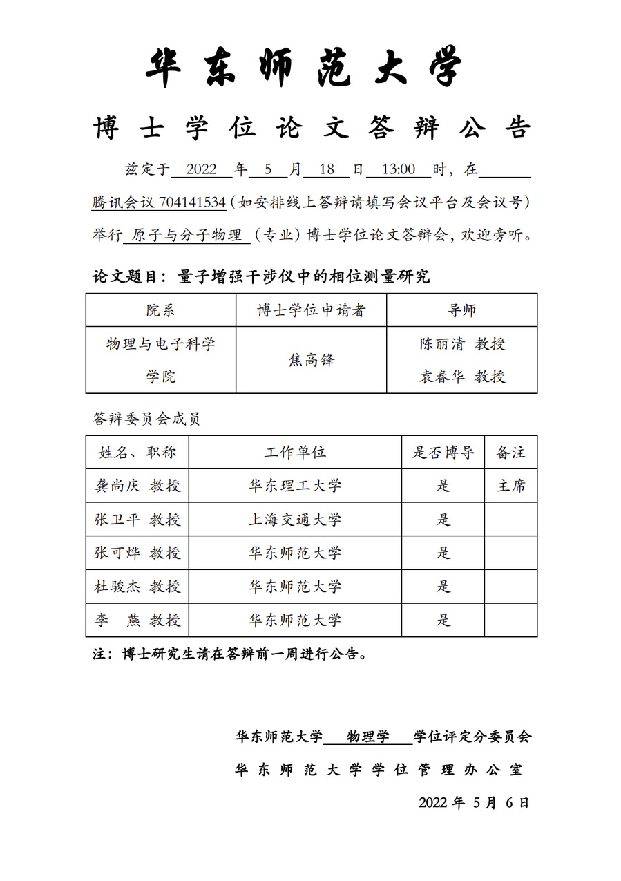 华东师范大学 博士学位论文答辩公告-焦高锋
