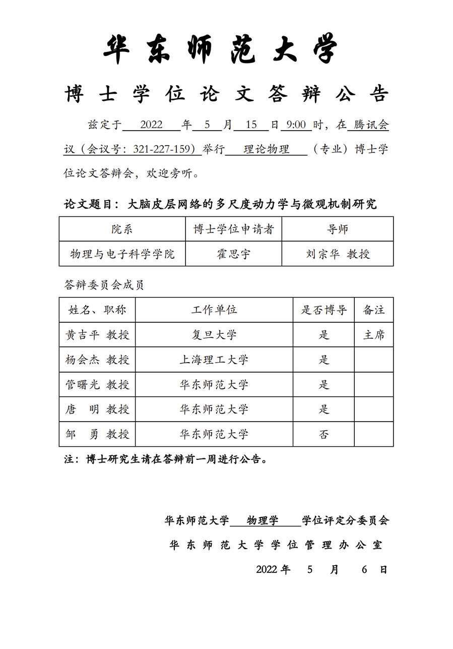 华东师范大学 博士学位论文答辩公告-霍思宇